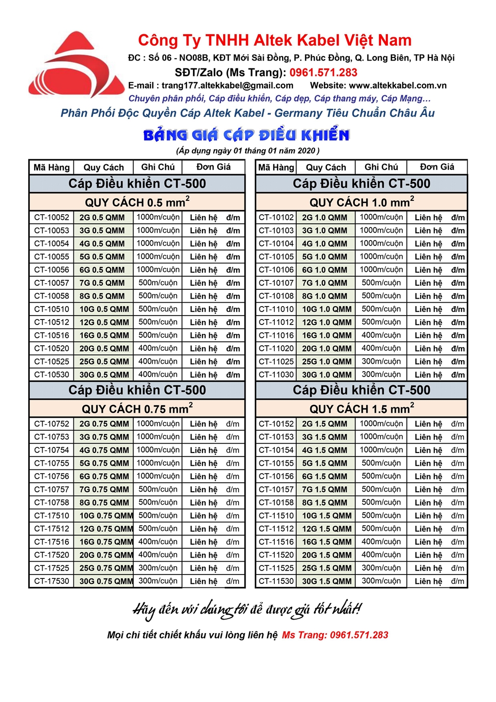 Bảng giá cáp điều khiển- cáp tín hiệu Altek Kabel mới nhất
