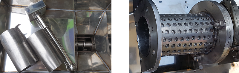 Phễu nạp to, rộng, chứa được nhiều nguyên liệu. Đặc biệt máy được trang bị thêm chày ép, dễ dàng đưa nguyên liệu xuống mà không bị tắc.