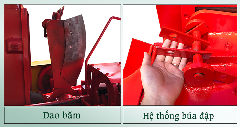 Buồng nghiền sẽ có chức năng băm nhỏ nguyên liệu với 4 dao to dầy dặn, sắc bén (kích thước dao to CD 50cm + CR 14,5cm) và 16 búa nghiền).