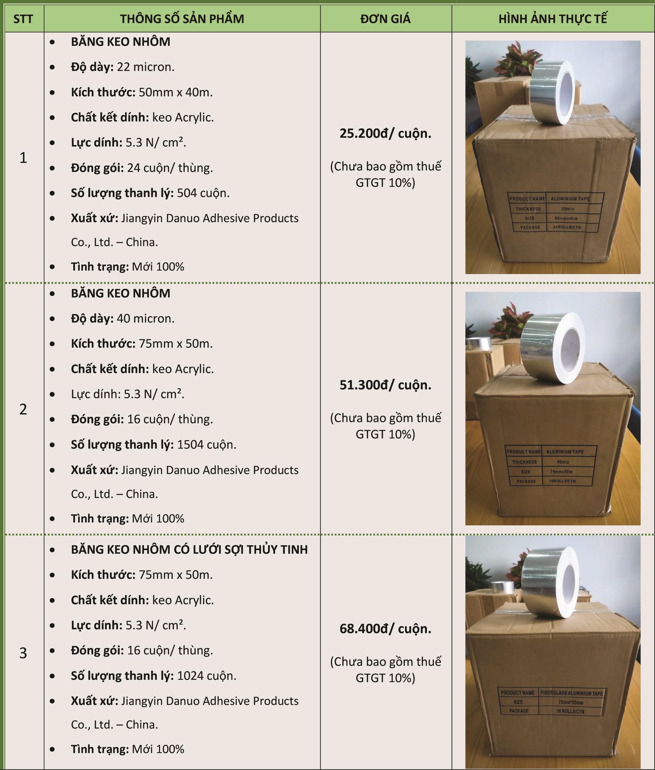 Hiện nay, công ty Hoàn Cầu đang còn dư số lượng lớn băng keo nhôm Aluminium Tape - nhập khẩu từ Jiangyin Danuo Adhesive Products Co., Ltd. – China. Do không còn sử dụng nên chúng tôi sẽ thanh lý với giá rẻ hơn giá chúng tôi nhập khẩu từ nhà sản xuất.